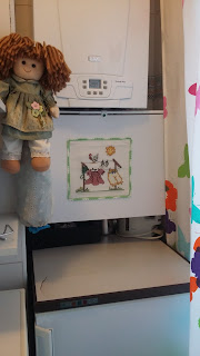 (A boneca era uma boneca de trapos que deram à Bia. Fiz uma manga em tecido, cosi-lhe debaixo da saia e é onde guardo os sacos de plástico.)