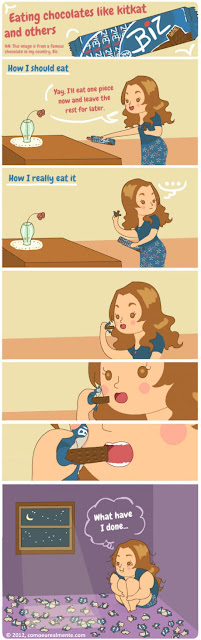 Esta semana, à pala da TPM - *coitadinha-de-mim-que-estou-com-dores-e-desconsolada-e-mereço-e-é-TPM-é-incontrolável* - enfardei chocolate à grande na 2ª feira à noite... e na 3ª feira à noite... e ontem à noite... e agora estou aqui a lutar comigo mesma para não ir tirar um chocolate quente da máquina porque RAISMAPARTA SE NÃO SOU MAIS FORTE DO QUE O VÍCIO!!